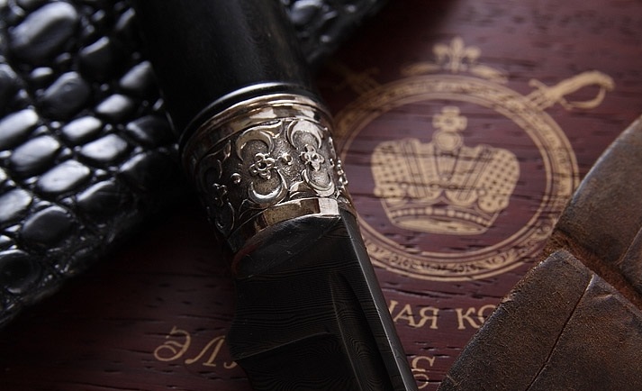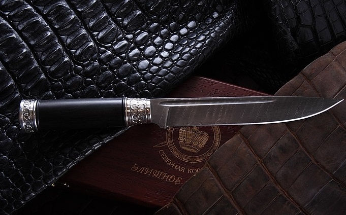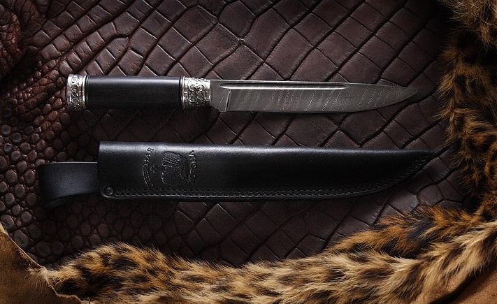 Очень функциональный нож, удобный и надежный на охоте и в хозяйстве. Красивый клинок с долами, которые придают дополнительную жесткость при боковых нагрузках. Простая цилиндрическая ручка удобна для хвата в любом положении. Не броский прибор на рукояти ножа, выполненный в якутских, бурятских и монгольских традициях. Гарда и навершие выполнены из итальянской бронзы и покрыты серебром.